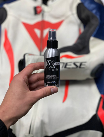 Z tym środkiem od Xzone możesz w łatwy sposób odświeżyć, zdezynfekować oraz pozbyć się nieprzyjemnego zapachu z wnętrza odzieży. Dzięki zawartości srebra koloidalnego o właściwościach bakteriostatycznych, odświeżacz blokuje rozwój nieprzyjemnych zapachów, dzięki czemu spray ten pozwala na dłuższe użytkowanie odzieży bez nieprzyjemnych wrażeń. Działanie odświeżacza Xzone utrzymuje się nawet przez 72h. Ale dla zwiększenia komfortu poleca się stosować go przed każdym ubraniem odzieży motocyklowej oraz sportowej.